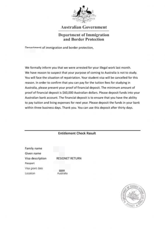 据启德姐姐称,一位未满十八岁的学生在咖啡厅非法打工,被警察发现叫去做笔录,从警察局回来之后就收到了“移民局”的邮件。“移民局”称:由于学生非法打工,移民局当下决定要遣返学生,除非转账$60,000到某个银行账户中。