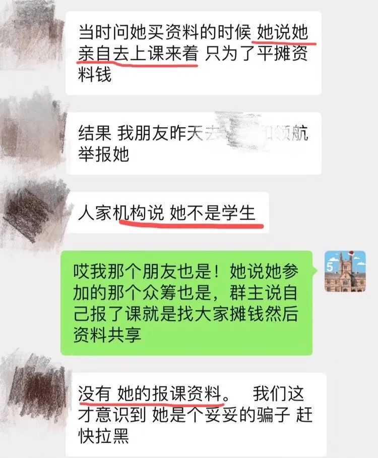 有骗子自称是悉大学生,在各种微信群中售卖课程资料。收了钱之后,同学索要资料时就说不是重点,自学就可以。应付不过去就用不完整的、坏损的音频资料糊弄人。