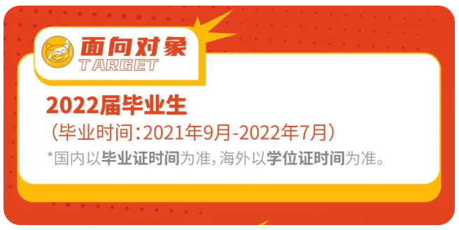 大部分企业秋招应届生招聘范围都是在今年秋季毕业至明年秋季毕业的学生,所以目前大二或研一在读的同学注意啦!!!校招较社招来说难度低了很多很多!请一定要珍惜自己的应届生身份,提前准备!那么该怎么判断自己是哪届应届生呢?大部分企业在招聘信息中都会明确给出一段时间区间,即为符合本届应届生的招聘范围。以今年网易招聘为例,毕业时间在21年9月至22月7月毕业的学生都是符合本次应届生的招聘范围的,国内毕业生以毕业证时间为主,留学生看我们的学位证就好啦,清晰明了。