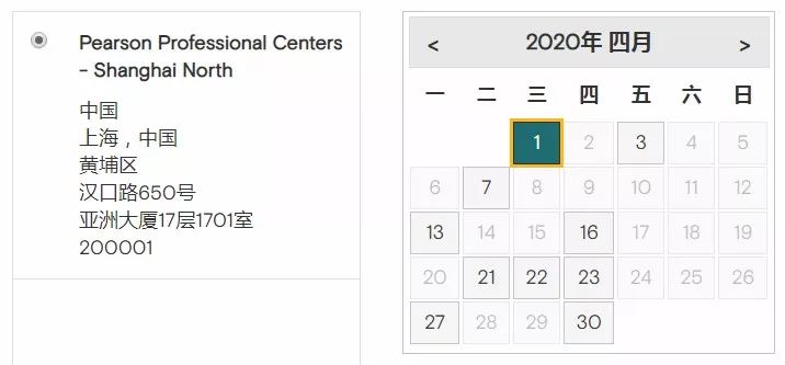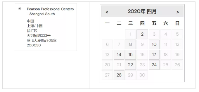 *Pearson Professional Centers-Shanghai North,剩余考位日期:4月1、3、7、13、16、21、22、23、27、30日*Pearson Professional Centers-Shanghai South,剩余考位日期:4月2、8、10、14、15、17、22、24、28日