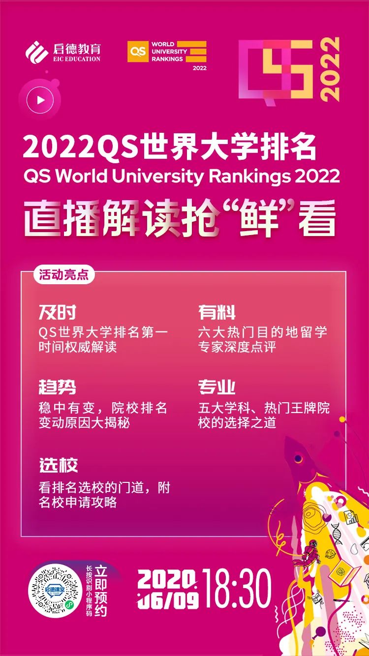 为了让同学和家长们对各院校排名有更加深入的了解,启德今晚18:30将推出《2022QS世界大学排名解读》大直播活动!两小时详细扒一扒排名背后的门道,扫描下方小程序码即可立即预约!