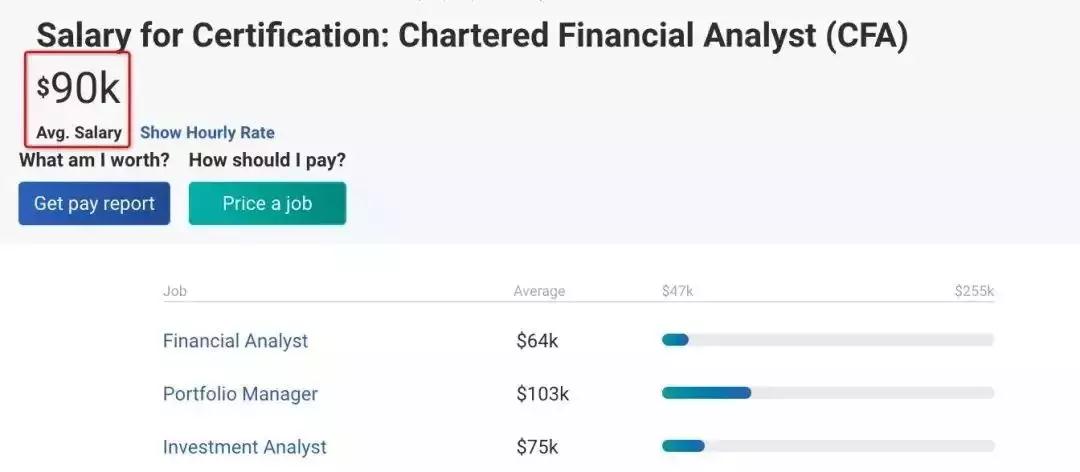学Finance、Economics、Marketing等金融相关专业的小伙伴们肯定对CFA、CPA等考试耳熟能详。简单直白点,它就是高薪、“人上人”的代名词。CFA证书意味着世界顶尖金融行业的通行证、华尔街入场券、国际前沿的金融理论和技术、金融圈高端人脉、无可比拟的高薪、国际职场明显的竞争优势、金融界最高端的资格认证、面向全球的金融专家许可证、全球最高等级的金融执业证书、系统的金融知识体系、高端大气上档次的雇主……拥有CFA资格证书的人收入明显高于同行。权威薪资网站PayScale数据显示,CFA持证人的平均薪资可高达 $90k!折合人民币63.6万!有没有心动的感觉!