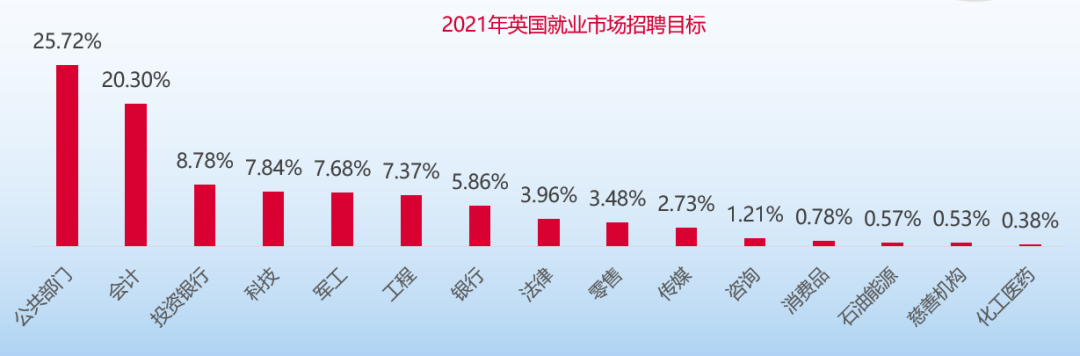 根据《High flier research 2021》的统计,疫情导致了英国短时期的求职不确定性,雇主会更加谨慎,部分岗位的需求有少量上涨,其中公共部门(包括警察、公务员等)、会计、投资银行和科技等领域的人才需求最为旺盛。
