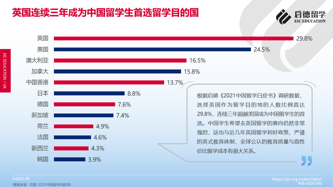 根据启德《2021中国留学白皮书》数据显示,英国已经连续三年成为中国留学生的首选目的国。不得不说,这次入境新政策的实施也将再次为英国圈一波中国留学生粉丝。