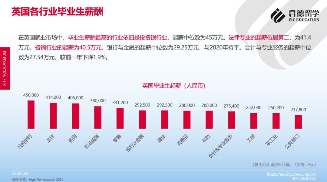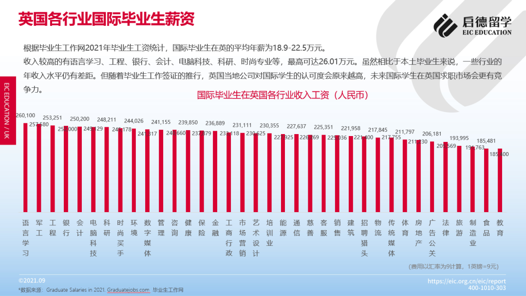 投资银行、法律和咨询行业的毕业生薪酬起薪更高,在英国就业市场中更吃香。 根据毕业生工作网2021年毕业生工资统计,国际毕业生在英的平均年薪为18.9-22.5万元。其中语言学习、军工、工程和银行等专业的国际毕业生收入更高。 对于未来准备到英国就业的同学来说,不妨根据上面的行业人才需求和毕业生薪酬进行参考,为将来规划选择做好准备。