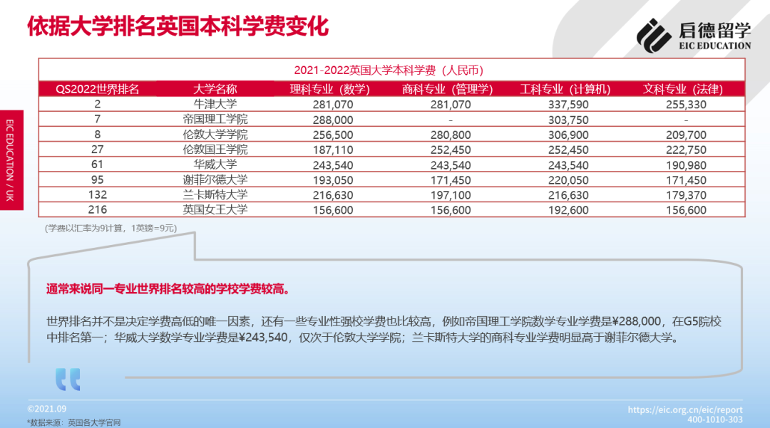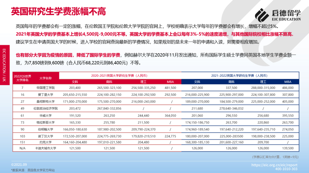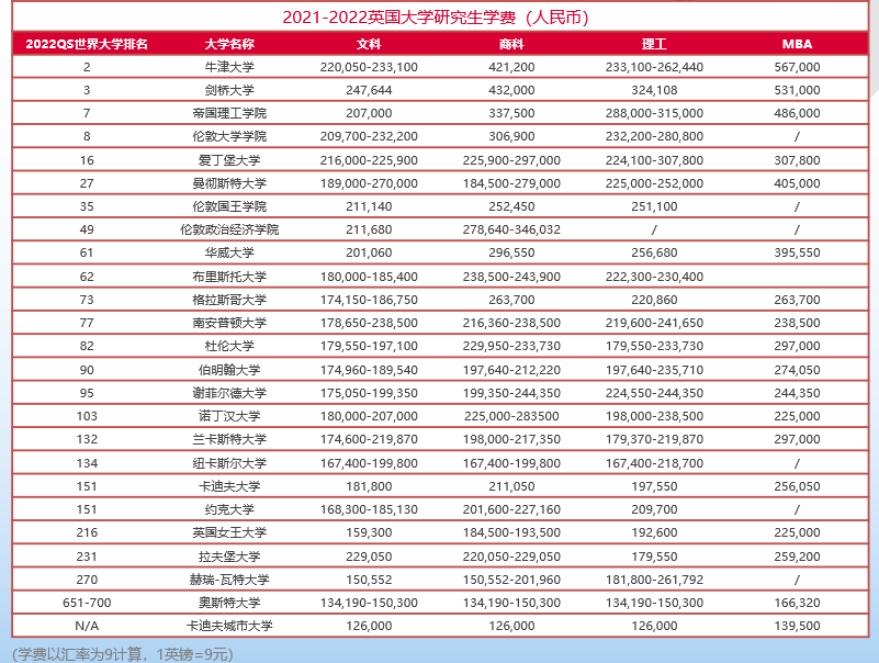 如果具体到大学的学费,根据报告显示:同一专业,世界排名较高,学费对应也会更高一些。不过世界排名也不是决定学费的唯一标准,专业性强的院校,学费自然也会更高一些。 英国研究生的学费涨幅不高,2021年英国大学的学费基本上增长4,500元-9,000元不等。而且也有部分大学因为疫情的缘故见底了国际学生的学费,也是非常良心了。 在英国研究生学费中,MBA费用最高,尤其是G5大学的MBA课程高达45万元以上。 除了学费,占留学生支出费用的很大比重的还有生活费。 本科生生活费参考: 伦敦地区每个月的生活费大约在£1,334(10,226元/月) 非伦敦地区每个月的生活费大约在£1,023(9,193元/月) 研究生生活费参考: 伦敦每月1,334英镑,合人民币10,226元(最多9个月) 伦敦以外每月1,023英镑,合人民币9,207元(最多9个月) 具体的生活费用同时也会受到汇率、地区、学生自身花销等因素的影响,同学们可以根据自己的目标进行精准计算。