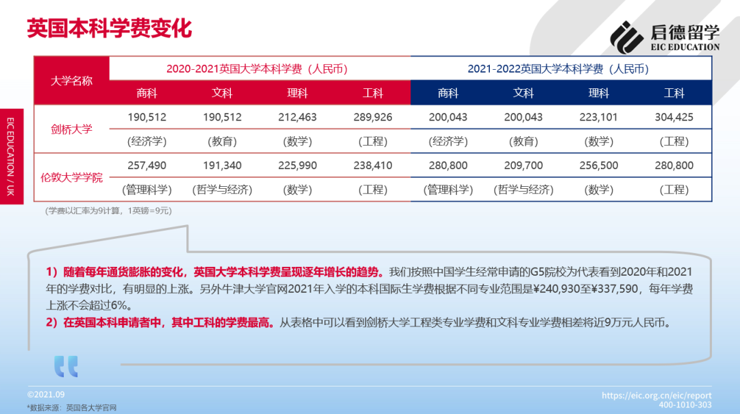 先来看看英国本科的学费情况。根据启德《2021英国留学报告》数据来看,英国大学本科学费有逐年增长的趋势,工科学费最高。剑桥大学工程类专业学费和文科专业学费相差将近9万元人民币。