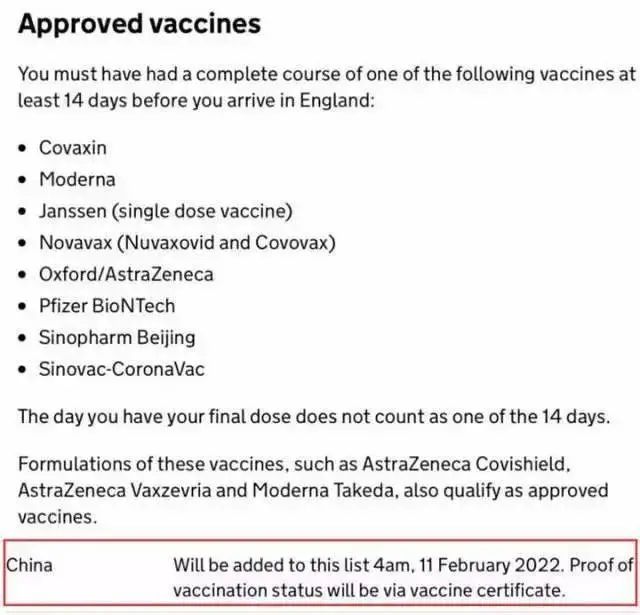 这也意味着英国承认中国疫苗,接种过2针北京生物和科兴生成的疫苗的小伙伴,去英国将不用准备行前检测、D2检测和自我隔离了!