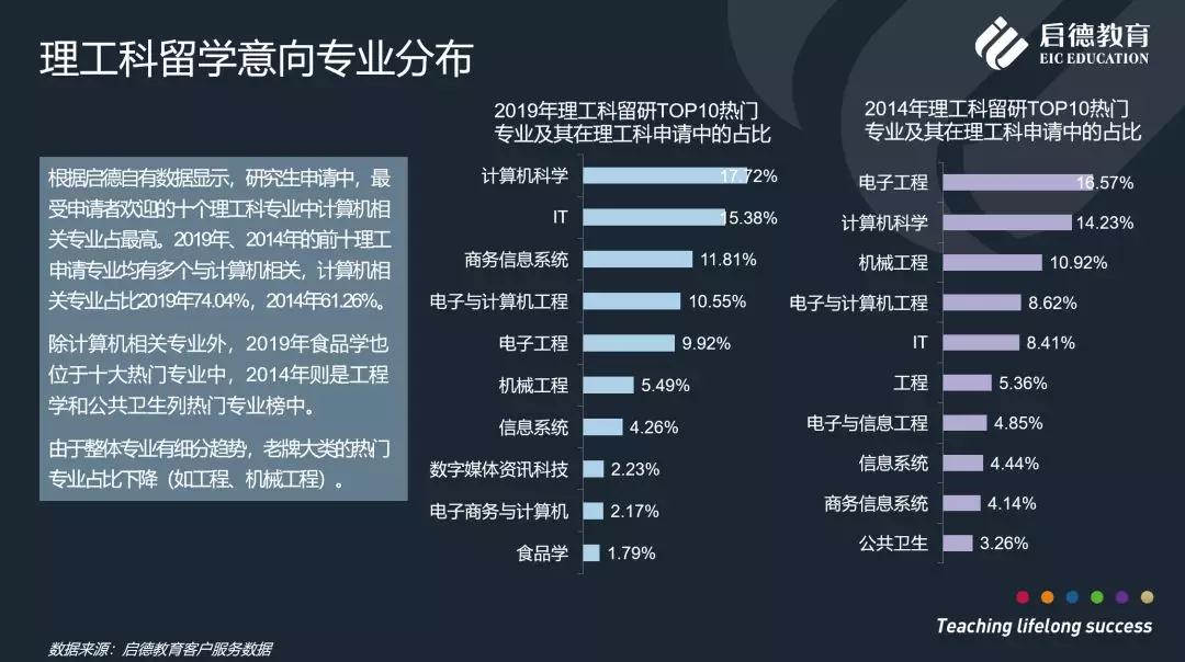 根据启德留学客户服务数据显示,2019年理工科留学十大热门专业为计算机科学17.72%、信息技术15.38%、商务信息系统11.81%、电子与计算机工程10.55%、电子工程9.92%、机械工程5.49%、信息系统4.26%、数字媒体资讯科技2.23%、电子商务与计算机2.17%、食品学1.79%。