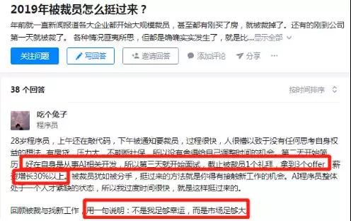 其中这个AI程序员的回答值得深思,被裁员后连拿3份offer,薪资增长30%。这种“逆袭的经历”让人羡慕,还有一句话点题“不是我足够幸运,而是市场足够大 。”