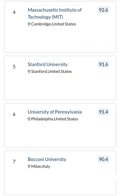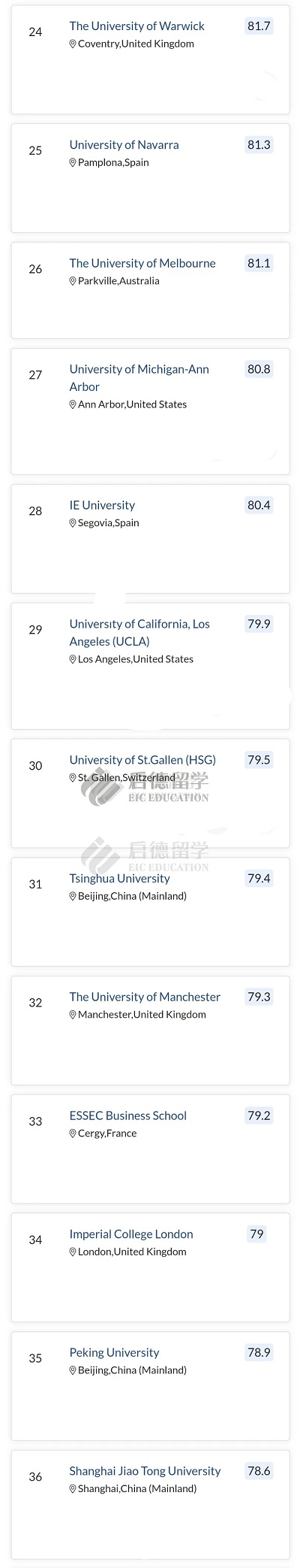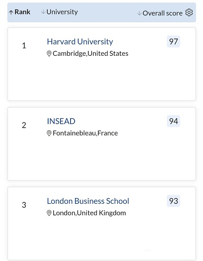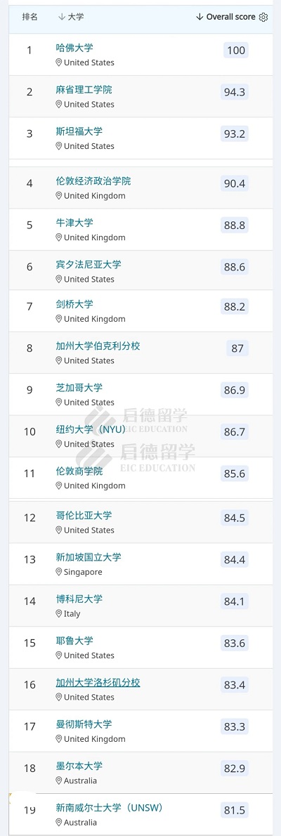 管理学专业排名中,欧洲高校展现了优势。法国的 INSEAD 商学院紧跟排名第 1 的哈佛大学,位列第 2,伦敦商学院排名第 3。