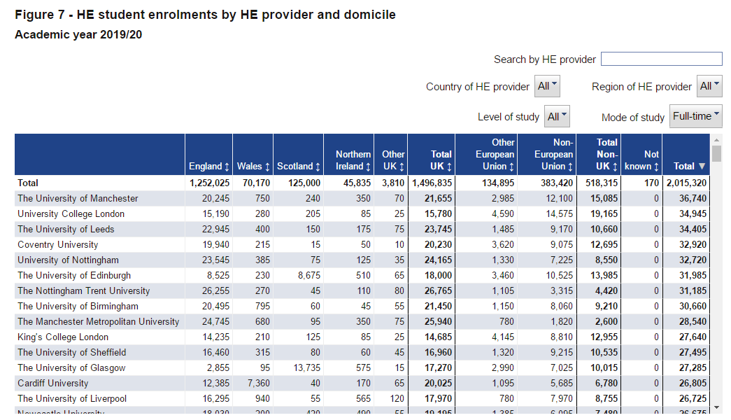 根据HESA的数据,招收全日制学生最多的大学是曼彻斯特大学,在19/20学年,曼彻斯特大学共拥有36,740名学生。