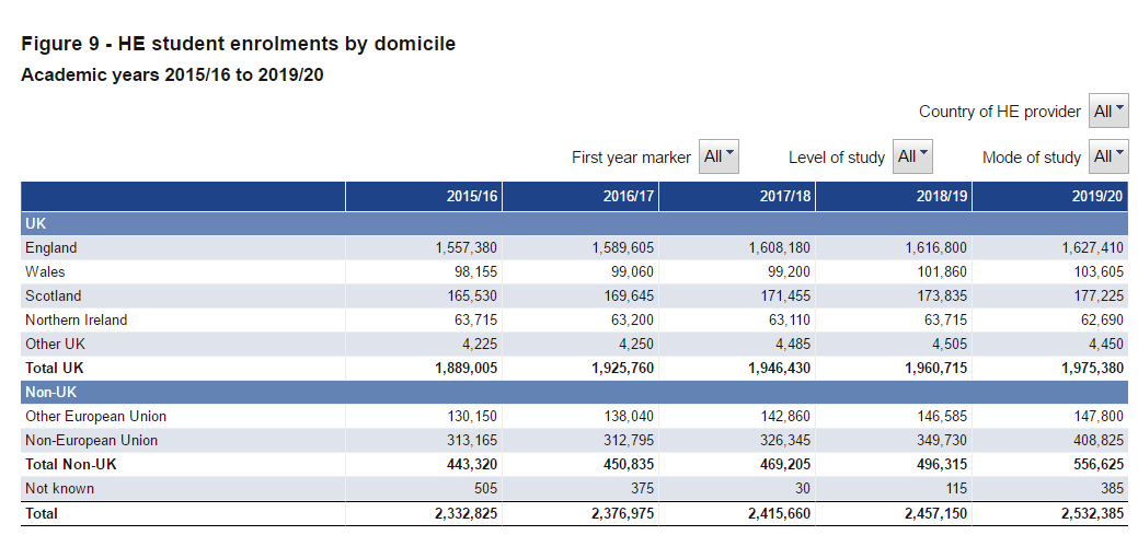 但此前《英国高等教育大数据》(Higher Education Student Statistics: UK,以下简称HESA)公布了最新的英国高等教育统计数据,包括大学录取专业数据、英国留学生数据等。