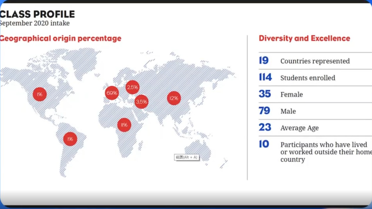 格勒高商是一个非常国际化的学校,在2020的intake中有114名学生,来自19个不同的国家和地区,平均工作年龄是23岁。