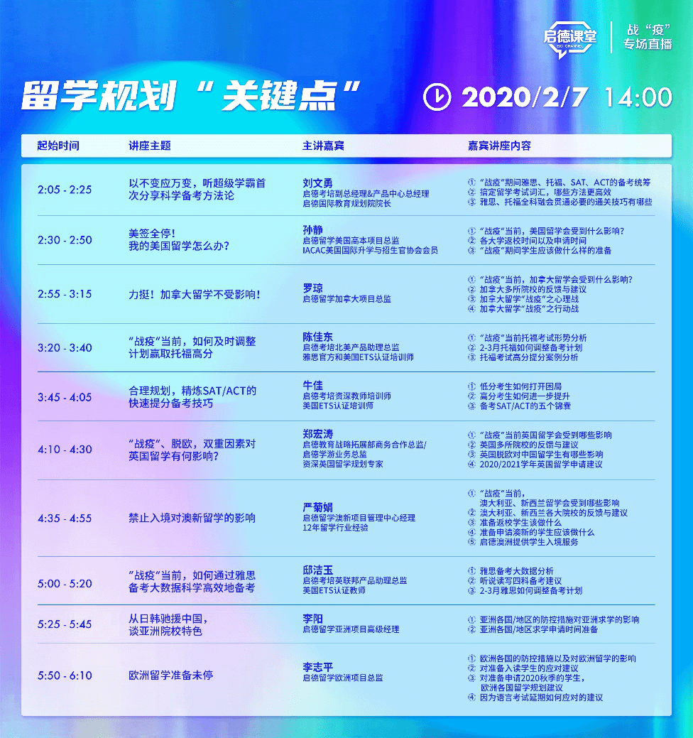 启德教育也于近日启用了“启德视频咨询平台”,为意向留学家庭提供在线留学咨询及服务指导,并通过启德留学微信公众号、启德课堂、启德视频咨询平台、启德考培在线、启德教育官方网站等平台,提供全面、及时的留学与出国考试相关的信息、服务与课程。更多关于新冠疫情对各国留学的影响及如何在这个特殊的时期下进行留学规划和备考,请关注2月7日14:00-18:10启德教育《特殊时期的留学规划“关键点”》专场直播。直播详情请点击咨询