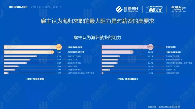 前程无忧、应届生求职网数据显示,雇主认为“对薪资待遇要求过高”(86.2%)、“不适应国内的工作环境”(75.3%)、“没有任何工作经验”(57.5%)、“专业能力不足”(48.7%)是海归就业的主要阻力。
