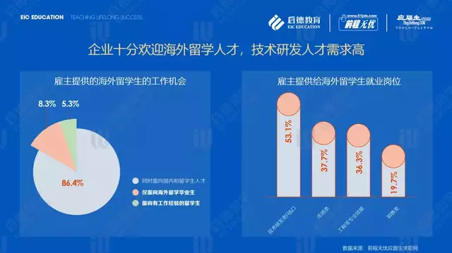 前程无忧、应届生求职网数据显示,2019年有海外留学生招聘计划的雇主中来自金融行业(14.1%)和信息技术服务行业的最多,对海外留学生的岗位要求是“技术研发类”(53.1%)、“市场类”(37.7%)、“工程等专业技能”(36.3%)、“销售类”(19.7%)。