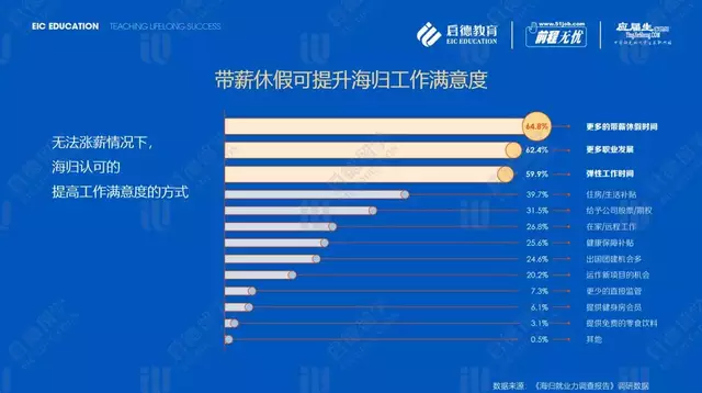 启德教育《2019海归就业力调查报告》调研数据显示,海归选择入职国有企业的仅占13.4%,超过七成选择就职私企以及外企,选择事业单位、中央/地方政府的比例不到10%。海归在国企的工作适应难度为11.9%,高于私企/ 民营(7.1%)和外企/ 合资企业(3.2%)。93.2%的海归认为弹性工作制重要,工作满意度较高的海归占比68.4%,“更多的带薪休假时间”(64.8%)、“更多职业发展”(62.4%)、“弹性工作制”(59.9%)、“住房/ 生活补贴”(39.7%)是海归认为除调整薪资外提升工作满意度的方式。