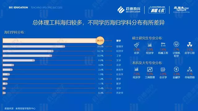 教育部留学服务中心数据显示,海归学历分布中硕士研究生占81.1%,其次为博士研究生学历,占比为12.5%,再次为本科及专科学历,占比为6.4%,高学历留学生已经占据了海归主流。学科分布中理工科与商科海归学生居多,理学海归占比28.3%,其次是管理学,占比19.5%;再次为经济学,占比16.1%;工学和文学占比分别为15.9%、9.9%。留学回国人员人数排名前5位的国家或地区是英国(34.1%)、美国(23.9%)、澳大利亚(8.3%)、中国香港(4.6%)、韩国(4.0%)。
