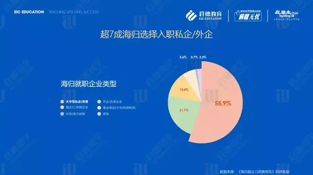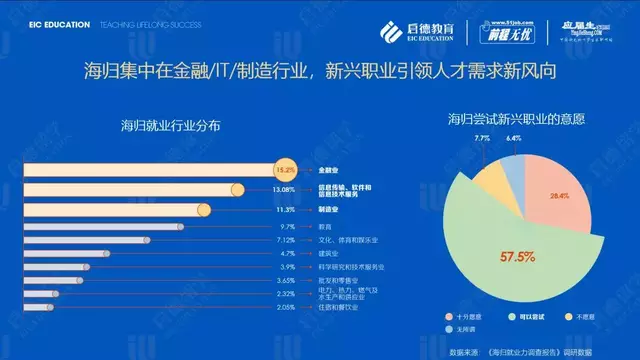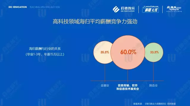 启德教育《2019海归就业力调查报告》调研数据显示,海归就业行业前五名分别是金融业(15.20%)、信息传输、软件和信息技术服务业(13.08%)、制造业(11.30%)、教育(9.70%)、文化、体育和娱乐业(7.12%)。针对毕业1-3年的海归薪酬调研结果显示,信息传输、软件和信息技术服务业年薪收入15万以上占比60%,而同等薪酬的海归群体在金融业与制造业的占比分别为35.3%与33.3%。