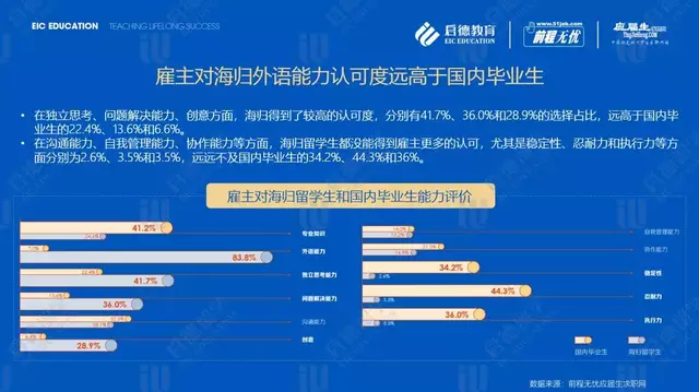 前程无忧、应届生求职网的另一组数据显示,在“外语能力”(83.8%)、“独立思考能力”(41.7%)、“问题解决能力”(36.0%)和“创意”(28.9%)方面,雇主对海归的评价高于国内毕业生。但是“沟通能力”(28.1%)、“自我管理能力”(13.2%)、”协作能力”(14.9%)方面均低于国内毕业生,尤其是“稳定性”(2.6%)、“忍耐力”(3.5%)和“执行力”(3.5%), 远远不及雇主对国内毕业生的能力评价(34.2%、44.3%、36%)。