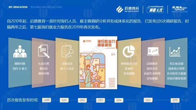 这些留学归国人员,被时代赋予了“海归”的标签,他们付出了什么?收获了什么?他们在求职就业中面临何种优势与困境?为了摸清“海归潮”之下的就业规律,2019年10月19日,启德教育与前程无忧、应届生求职网,再次联合发布《2019海归就业力调查报告》,以海归的概况、求职行为、就业行为作为分析的基础,结合雇主的招聘行为与用人行为,共同展开针对海归就业力的深度研究。这也是启德教育第7次发布海归就业力调查报告,通过结合就业市场最新的供需信息,为广大有求职需求的海归群体提供就业参考,并为有意赴海外留学或者正在海外留学的学生群体提供国内就业的动态趋势。