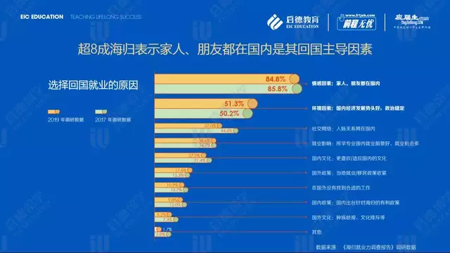 启德教育《2019海归就业力调查报告》调研数据显示,84.8% 的海归表示“家人、朋友都在国内”是其回国就业的主导因素。其他影响海归回国就业的主导因素包括 “国内经济发展势头好,政治稳定”(51.3%)、“人脉关系网在国内”(37.0%)、“所学专业国内就业前景好、就业机会多”(34.6%)。值得注意的是,与启德教育《2017海归就业力调查报告》调研数据相比,因为“国内经济发展势头好”和“国外就业/ 移民政策收紧”,选择回国就业的占比有所提升,分别提高了1.1%与2.3%。海外政策“推力”与国内经济“拉力”共同影响了留学生的回国决策。