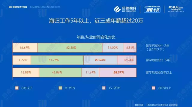 启德教育《2019海归就业力调查报告》调研数据显示,毕业1-3年(含1年以下),海归群体收入整体集中在8-15万(62.5%);毕业工作3-5年,年薪15-20万元的人数占比明显提升,达到了23.53%;毕业工作年限达到5年,接近30%的人进入年薪20万元以上。就业3-5年的理工科专业海归年薪在15-20万元占比41.67%,而商科同样薪酬人群占比仅为19.64%;就业年限5年以上的理工科海归年薪20万元以上占比38.46%,商科同薪酬人群占比为24.53%;理工科海归薪资普遍高于商科。
