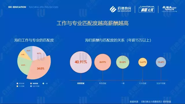 前程无忧、应届生求职网数据显示,超8成雇主关注院校专业与岗位的匹配度。启德教育调研数据显示,海归工作与专业匹配度的分布情况是:“非常匹配”(20.7%)、“有些匹配”(34.0%)、“一般”(25.4%),“不太匹配”(9.9%)、“完全不匹配”(10.0%)。“非常匹配”的海归年薪在15万以上占比40.91%,而“有些匹配”、“一般”、“不太匹配”、“完全不匹配”年薪15万以上的比例分别为28.97%,22.22%,16.67%,18.60%。工作与专业匹配度越高,海归的薪酬也越高。