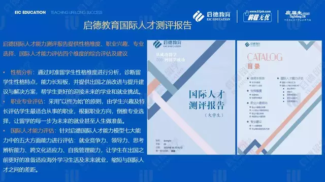 如何帮助海归留学生进行自我认知与职业规划?从成长为国际化人才所需要培养的能力入手,启德国际人才能力测评3.0通过对学生进行性格、专业倾向、职业倾向、国际人才能力四个维度的评估,解决学生在留学专业和职业选择、个人能力评估和提升,及境外适应中产生的一系列问题,能帮助学生全面提升就业竞争力、领导力、思考辨析力、跨文化适应力、自我管理能力这五大国际人才能力。目前测评报告分为大学生、中学生版,配套的服务内容包括低龄学生选课指导、高中生选专业指导、大学生专业选择/职业/能力提升建议等,启德国际人才能力测评上线以来,已帮助过万名启德学生量身定制了留学规划。