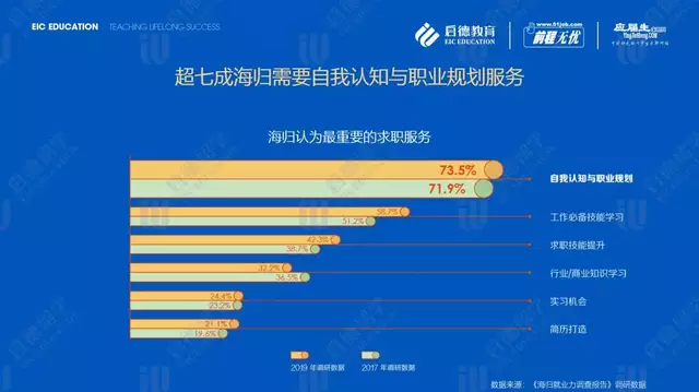 启德教育《2019海归就业力调查报告》调研数据显示,9成以上(92.5%)的海归表示在求职过程中遇到了问题。“没有相关工作经验”(58.7%)是海归回国求职过程中遇到的主要问题,其次是“海内外求职者众多、竞争压力大”(40.4%)。在海归认为的最重要的求职服务中,排名第一的是“自我认知与职业规划”,占比73.5%,可见职业规划是目前海归群体寻求求职服务的第一诉求。