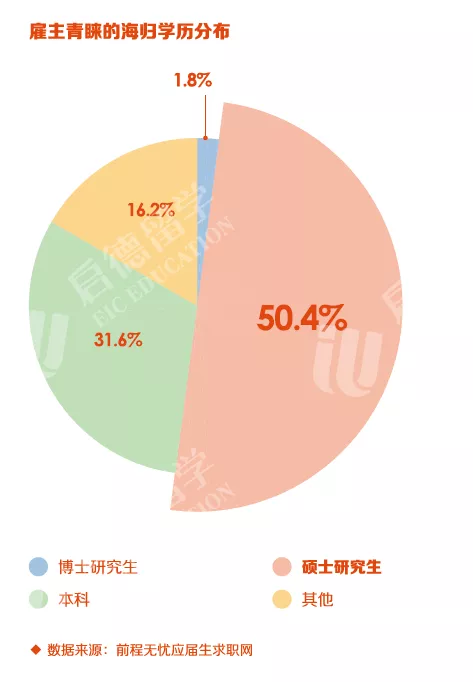 从中可知,海归大多来自于主流留学目的地。其中来自英国的留学生占比接近一半,一定程度上与英国近年来的留学热度有关,英国的一年制硕士学制吸引了大批的国内本科毕业生选择英国作为自己的留学目的地。关于雇主青睐的海归学历,前程无忧相关调研结果显示,研究生以上学历占比52.2%,其中博士研究生1.8%,硕士研究生50.4%;本科31.6%。这一方面是因为目前海归群体中研究生学历人数占比最高,另一方面也是因为国内名企对求职者的学历有所要求。