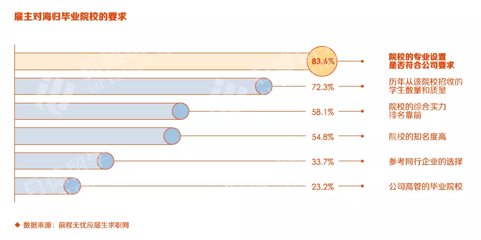比如金融行业、热门的投资银行、证券公司等研究生以上学历是基础条件,最好能够是名校研究生。对于一些军工集团及下属各研究所,基本上研究生学历是筛选简历的第一条件,有些岗位甚至是博士研究生学历才会更有优势。关于雇主对于海归求职者的毕业院校的要求,《2019海外留学生优秀人才需求报告》调研数据显示,院校的专业设置是否符合公司要求是雇主关注的重要条件,占比83.6%。