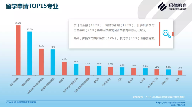 2015-2020启德留学客户服务数据显示,留学申请十大专业分别为会计与金融(15.18%)、商务与管理(13.24%)、计算机科学与信息系统(8.11%)、传播学与媒体研究(7.83%)、教育学(4.07%)、经济学与计量经济学(3.45%)、社会政策与行政管理(2.84%)、建筑学(2.81%)、艺术与设计(2.54%)、法学(2.40%)。2015-2020年,商科申请占比始终排在首位,留学选择多元化,社会科学以及理工科申请占比总体呈上升趋势。