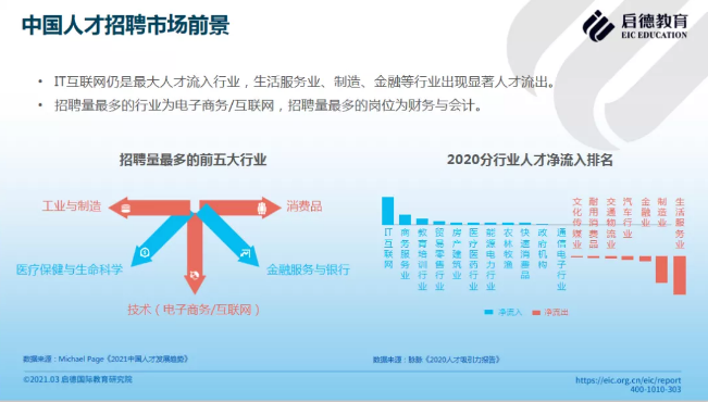 根据白皮书调查显示,IT互联网仍是最大人才流入行业,生活服务业、制造、金融等行业出现显著人才流出。招聘量最多的行业为电子商务/互联网,招聘量最多的岗位为财务与会计。