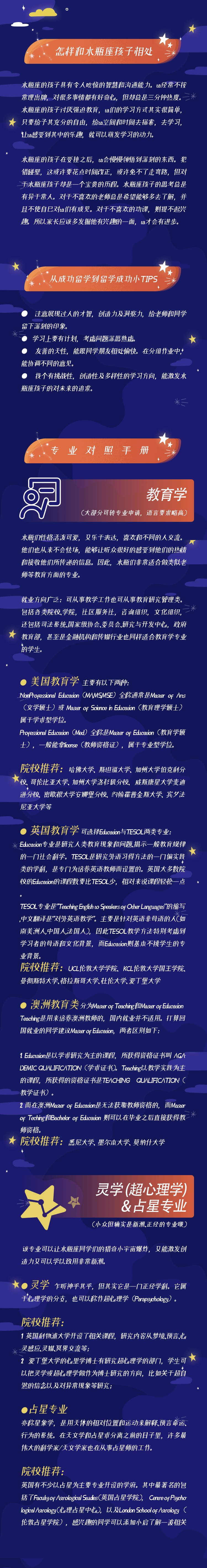 近年来星座学在广大年轻人的话题热度有增无减,每个人都有自己的十二星宿,常是大家讨论的时尚话题。借助星座学进行运势预测、性格分析、事业选择、恋爱配对指数等等,借此更好地了解自己和身边的人。 身为(准)留学生你,或您的孩子适合留学吗?留学适应性将会如何?生活态度、饮食健康、社交能力等是否存在挑战? 欢迎解锁「一起来看留星语」吧 30秒看水瓶座 喜欢未知的紧张和心跳 他们的生活就像拆盲盒 留学是一场冒险 充满未知与期待 如果一个水瓶座 去留学 作为社交达人的水瓶座,面对陌生环境完全不害怕,甚至还有些小激动!水瓶座的留学生活会相信充满乐趣和惊喜,什么交友交流问题,小组合作,Ta们都会一一解决,融入新环境,国际环境和开放的文化包容正适合瓶子们激发天性,Ta简直太适合去看看外面的世界啦~ 留学适应力:★★★★☆ Ta们也是水瓶座哦 爱迪生;沃特.迪斯尼 (迪士尼创始人) 约翰.彭伯顿 (可口可乐创始人) 林肯、乔丹 章子怡 邓丽君 王祖贤 宋茜... 好啦,30秒了解完瓶子 如何和Ta们相处呢? 瓶子们如何留学成功? 有什么专业适合Ta们? 我们一起来看看!