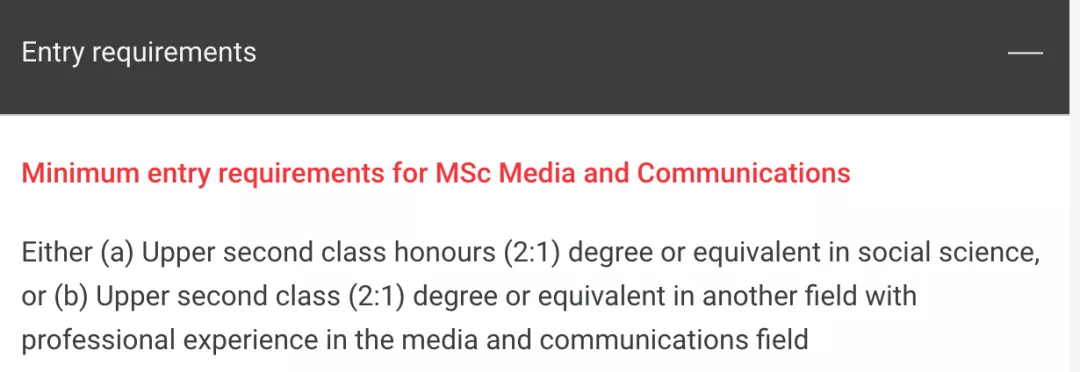 比如下图是LSE对于Media and Communications专业的入学标准,其中表示,接受任何社会科学类专业在读学生申请,同时,对于非社科类专业学生,只要有传媒相关的实习经历也是可以申请的。