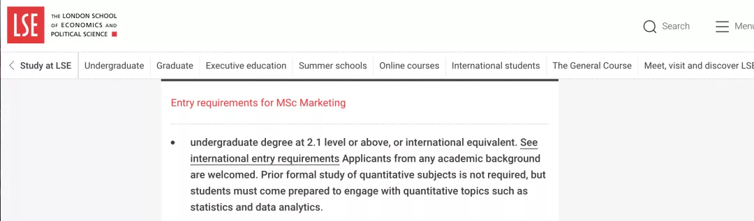 以LSE为例,LSE在官网上对于MSc Marketing的Entry Requirement 明确表示,欢迎任何专业背景的学生申请(Applicants from any academic background are welcomed)。