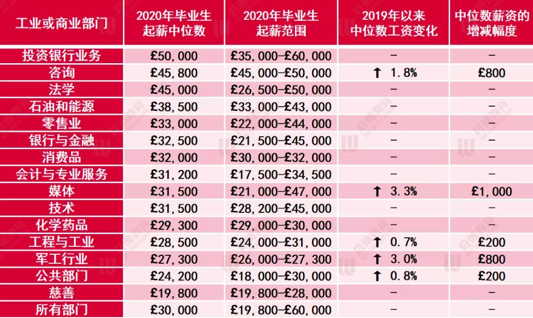 在英国就业市场中,毕业生薪酬最高的行业依旧是投资银行业,起薪中位数为5万英镑。 英国本地顶级战略咨询公司已将其毕业生薪酬提高至45800英镑。 英国顶级律师事务所的实习律师薪酬为45000英镑。 军工部门和工业雇主、公共部门组织和媒体公司的起薪中位数也有所上升。