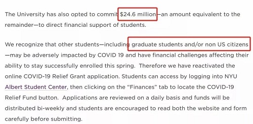纽约大学留学生每人都将获得最多2000美元的补助金。因受疫情严重影响,美国国会通过了救济金拨款法案,NYU的所得的救济金,也就是HEERF II资金总额为3740万美元。为了支持学生春季入学,纽约大学决定除了给符合条件的美国籍本科生发放救济金外,还启动了2460万美金金额的救济金,研究生和非美国公民都有机会领取。一学期可领取一次,最多可高达2000美金。