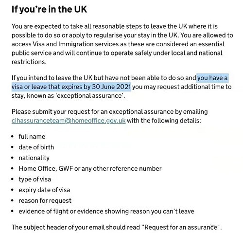 如果你的签证截止日期或exceptional assurance延期的有效期是2021年6月30日之前,但由于各种原因不能离境等原因,可以继续去申请这个EA(exceptional assurance) ,此前是2月28日截止、又改到3月31日截止、4月30日截止,现在进一步延长一个月到6月30日。