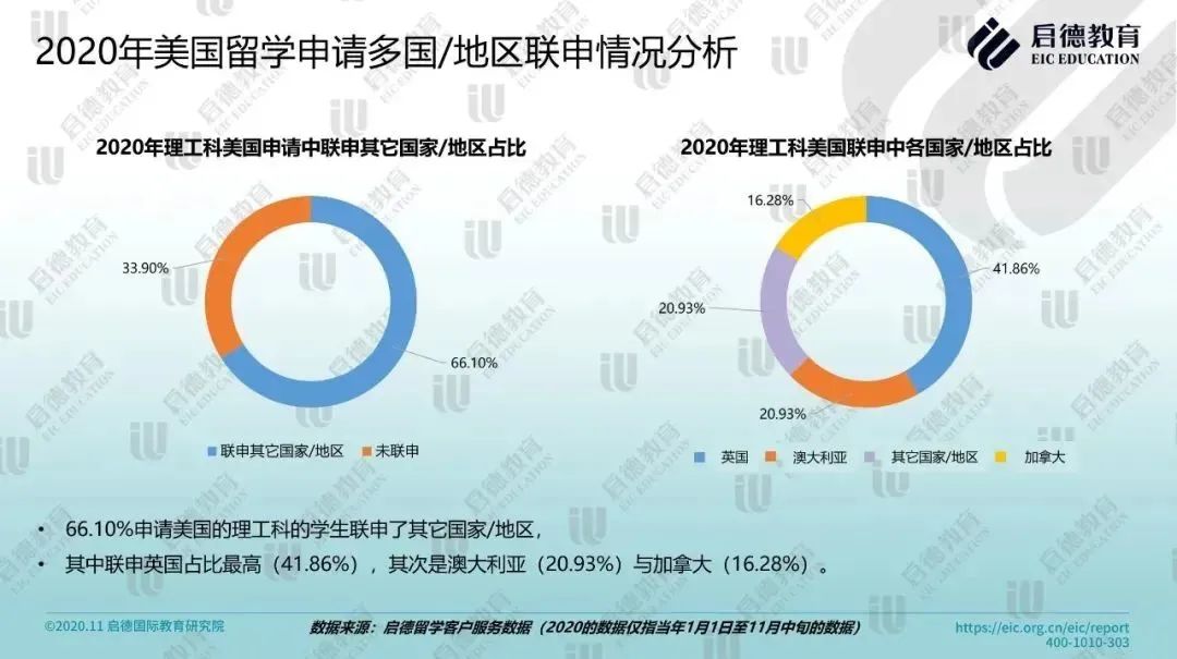受疫情与签证政策影响,一部分原本单申请美国或澳大利亚的学生选择联申英国、加拿大等其它国家与地区,2020年启德留学客户服务数据显示,66.10%申请美国高校理工科的学生联申了其它国家及地区,其中联申英国的占比最高(41.86%),其次是澳大利亚(20.93%)与加拿大(16.28%);64.96%申请澳大利亚高校理工科的学生联申了其它国家与地区,其中联申英国占比最高(45.12%),其次是中国香港(17.07%)与美国(14.63%)。