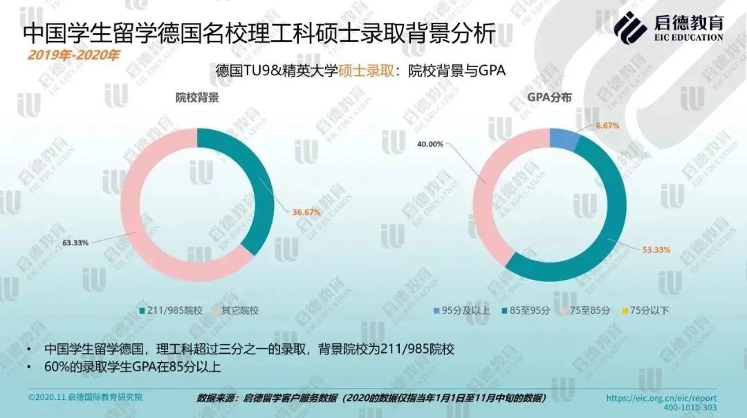 作为欧洲经济发动机和世界制造业大国,德国的理工科院校在世界范围内享有盛誉。2019-2020年启德留学客户服务数据显示,德国TU9&精英大学的理工科硕士录取学生中,超过三分之一来自211/985院校,60% 学生GPA在85分以上。