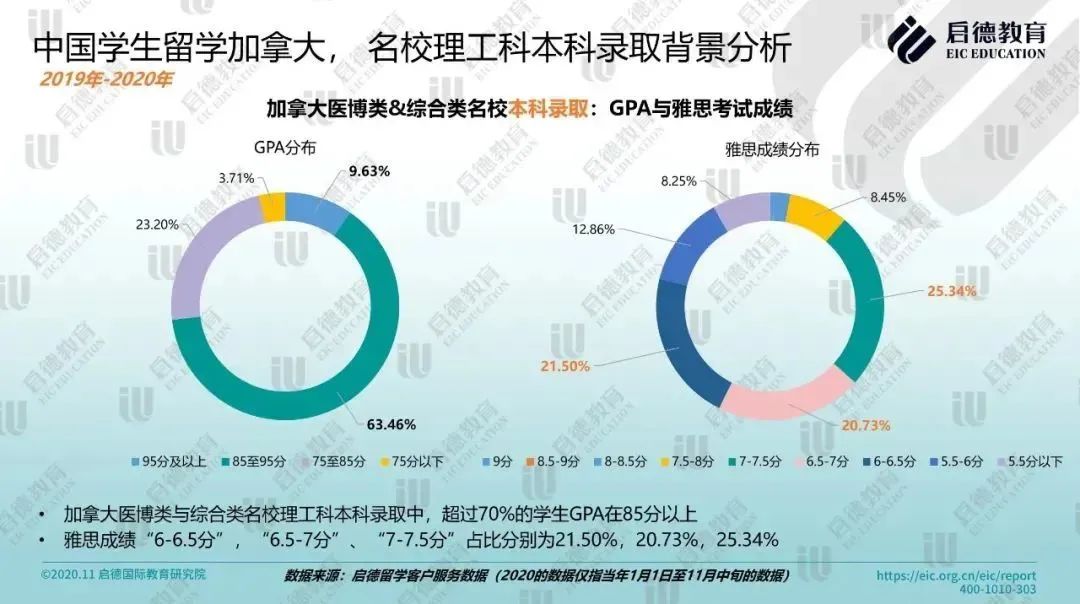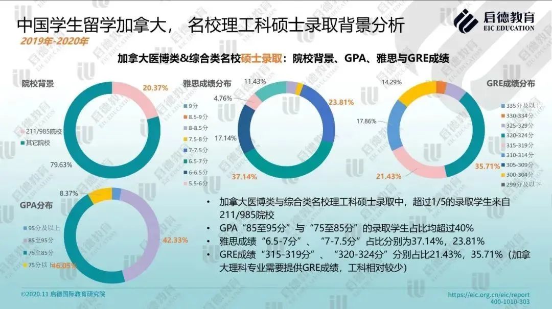 另一组数据显示,加拿大医博类与综合类名校理工科本科录取学生中,超过 70% 学生 GPA 在 85 分以上,雅思成绩 “7-7.5分”占比为25.34%;硕士录取学生中,超过1/5来自 211/985 院校,GPA “85至95分” 与 “75至85分” 占比均超过40%,雅思成绩 “6.5-7分”、“7-7.5分” 占比分别为 37.14%、23.81%,GRE成绩 “320-324分”占比 35.71%(加拿大理科研究生专业需要提供GRE成绩,工科相对较少)。