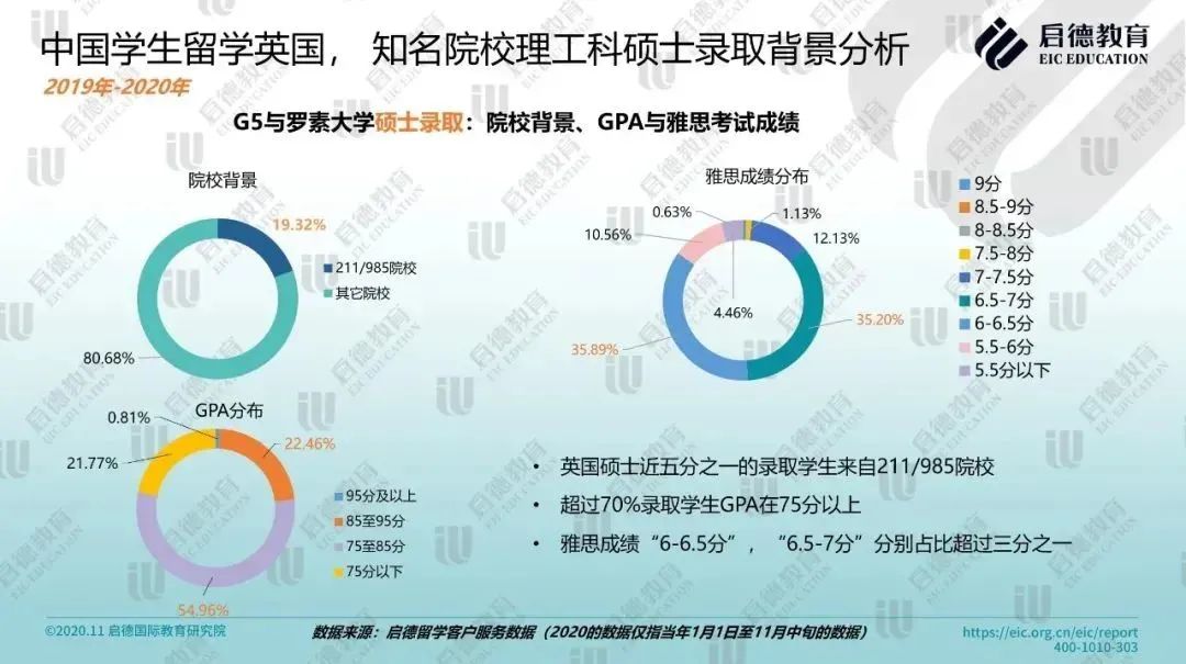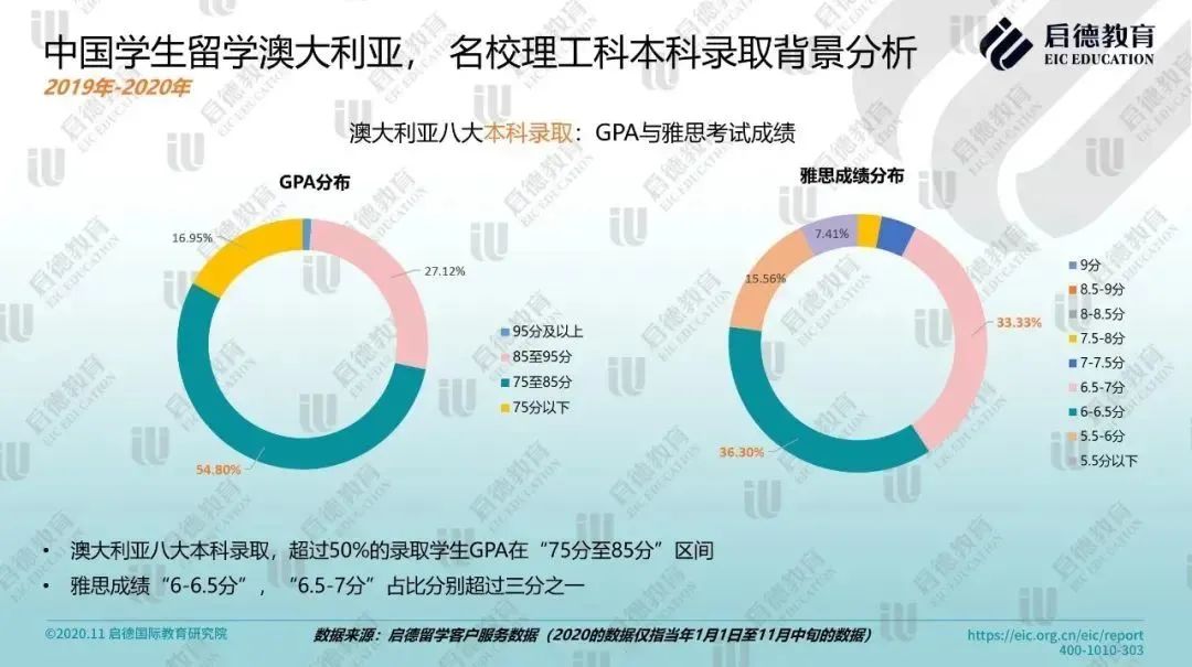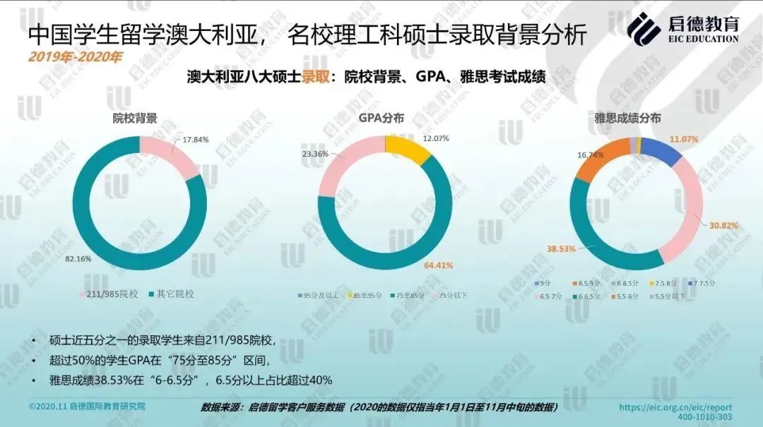 2019-2020年启德留学客户服务数据显示,澳大利亚八大名校的理工科本科录取学生中,超过50%的录取学生GPA在 “75分至85分” 区间,雅思成绩 “6-6.5分”,“6.5-7分” 占比分别超过三分之一;硕士录取学生中,近五分之一来自211/985院校,超过50%学生 GPA在 “75分至85分” 区间,雅思成绩6.5分以上占比超过40%。