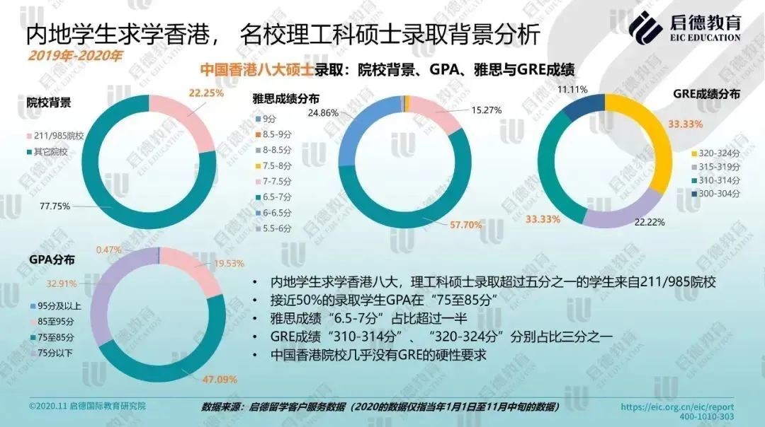香港八大名校的理工科硕士录取学生中,超过五分之一来自 211/985 院校,近一半 GPA 在 “75至85分”,雅思成绩 “6.5-7分” 占比超过一半。