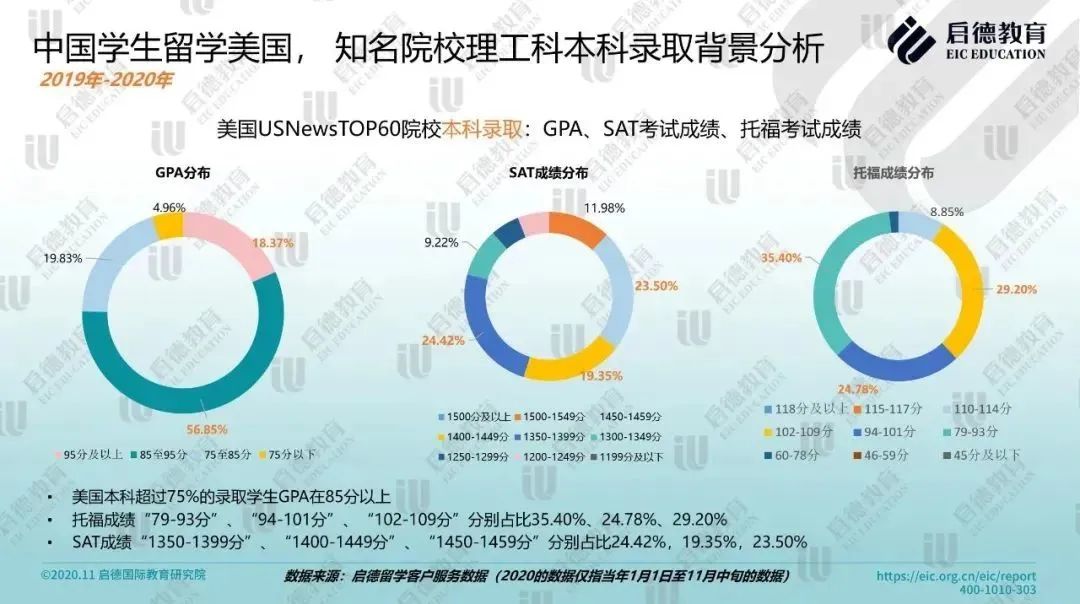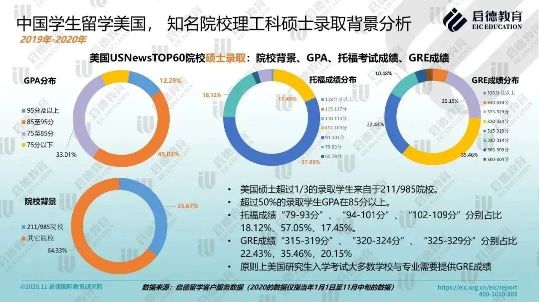 2020《美国门户开放报告》数据显示,来自中国内地的372,532名学生中,就读人数最多的是数学与计算机科学专业,占比达21.2%,其次是工程类专业(17.5%),物理与生命科学(8.4%)排名第五。2019-2020年启德留学客户服务数据显示,美国 USNews TOP 60 院校的理工科本科录取学生中,超过75%的学生 GPA 在85分以上,托福成绩 “79-93分”占比为35.40%,SAT成绩“1350-1399分”占比24.42%;硕士录取学生中,超过1/3来自于211/985院校,超过50% 学生GPA在85分以上,托福成绩“94-101分”占比57.05%,GRE成绩 “320-324分”占比35.46%,原则上,申请美国大多数学校与专业的硕士课程都需要提供GRE成绩。