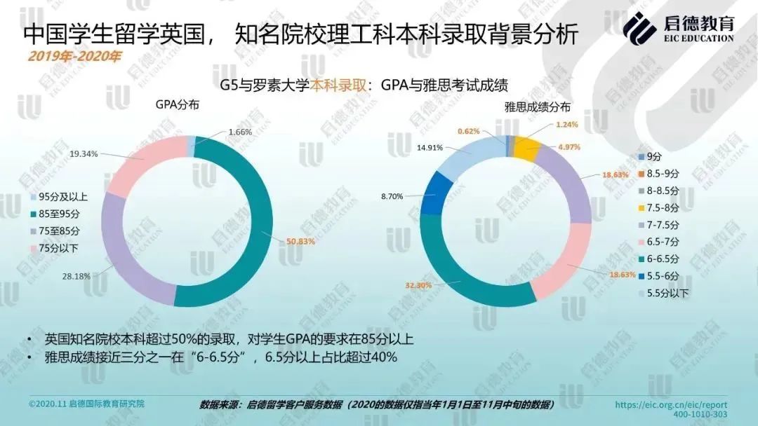 英国大学和学院招生服务中心 UCAS 数据显示,工程技术(40,250)是2020年英国非欧盟学生本科申请人数最多的专业之一,与2019年相比同比上升6.7%。HESA数据显示,2018-2019年度英国生物科学、工程技术学、医学相关学科、物理科学类专业均有不同程度的上升。2019-2020年启德留学客户服务数据显示,英国G5 与罗素大学的理工科本科录取学生中,超过50% 学生 GPA 在85分以上,雅思6.5分以上占比超过40%;硕士录取学生中,近五分之一来自211/985 院校,超过70%学生 GPA 在75分以上,雅思成绩 “6-6.5分”、“6.5-7分” 分别占比超过三分之一。