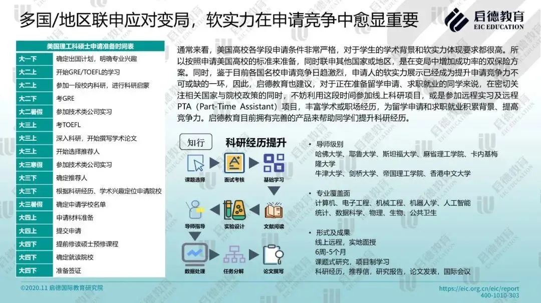 新基建浪潮带来的万亿级市场机会,以及5G、AI、智能计算等带来的高科技新赛道,使得计算机科学与信息系统、电子电气工程、机械工程专业将一直保持申请热门,对数学、生物科学、新材料等基础学科的人才也产生了巨大的需求。在理工科热门专业申请愈加激烈的当下,申请人的科研能力与实习经历更显重要,启德教育建议,申请人可以通过参加科研经历或职场背景提升项目,接触计算机、人工智能、电子工程、5G网络、机器人、数据科学、金融科技等各类热门专业的前沿课题,提升科研能力,丰富职场经历。