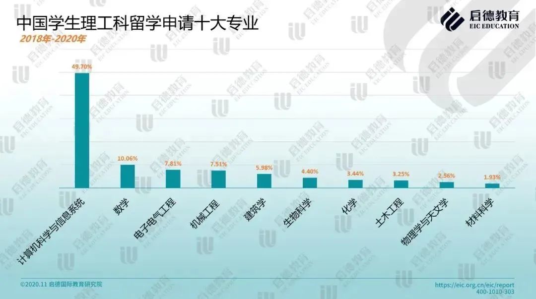 理工科留学热门专业有哪些?2018-2020年启德留学客户服务数据显示,中国学生理工科留学申请最青睐的十大专业分别是:计算机科学与信息系统、数学、电子电气工程、机械工程、建筑学、生物科学、化学、土木工程、物理学与天文学、材料科学。